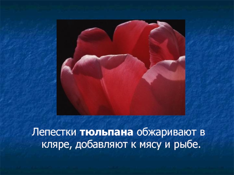 Лепестки тюльпана обжаривают в кляре, добавляют к мясу и рыбе.