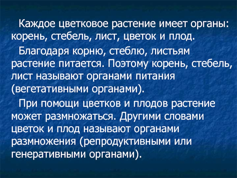 Благодаря корню, стеблю, листьям растение питается. Поэтому корень, стебель, лист называют органами питания (вегетативными органами).