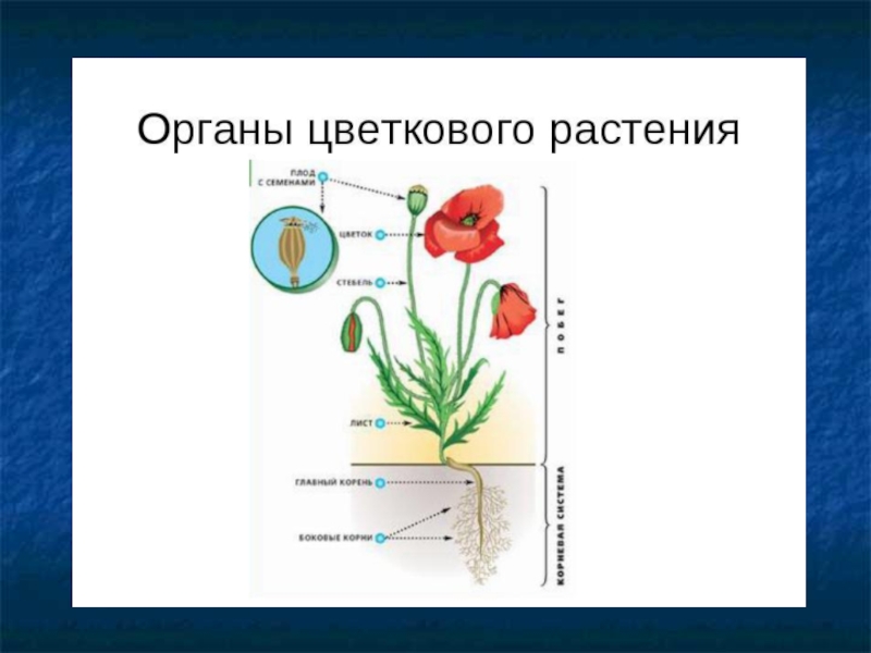Слайд 3 Каждое цветковое растение имеет органы: корень, стебель, лист, цветок и