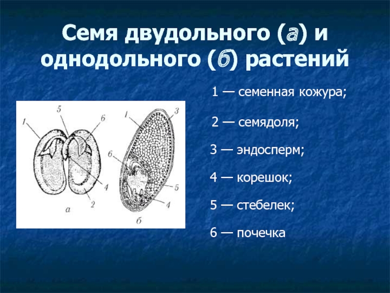 Слайд 22Семя двудольного (а) и однодольного (б) растений