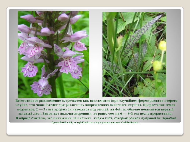 что чаще бывает при различных повреждениях основного клубня). Прорастание семян подземное, 2 — 3 года проросток находится под землей, на 4-й год обычно появляется первый зеленый лист. Зацветает пальчатокоренник не ранее чем на 6 — 8-й год после прорастания.