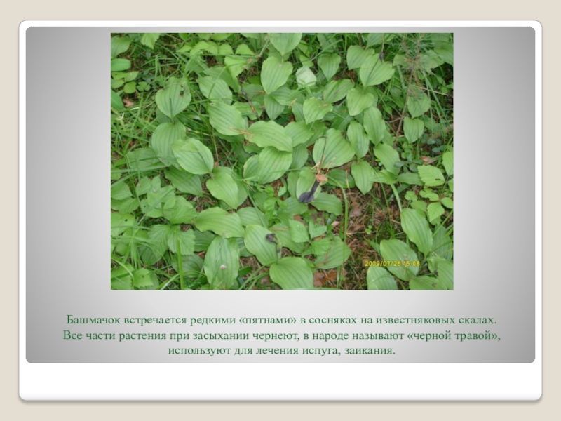 Слайд 34Башмачок встречается редкими «пятнами» в сосняках на известняковых скалах.