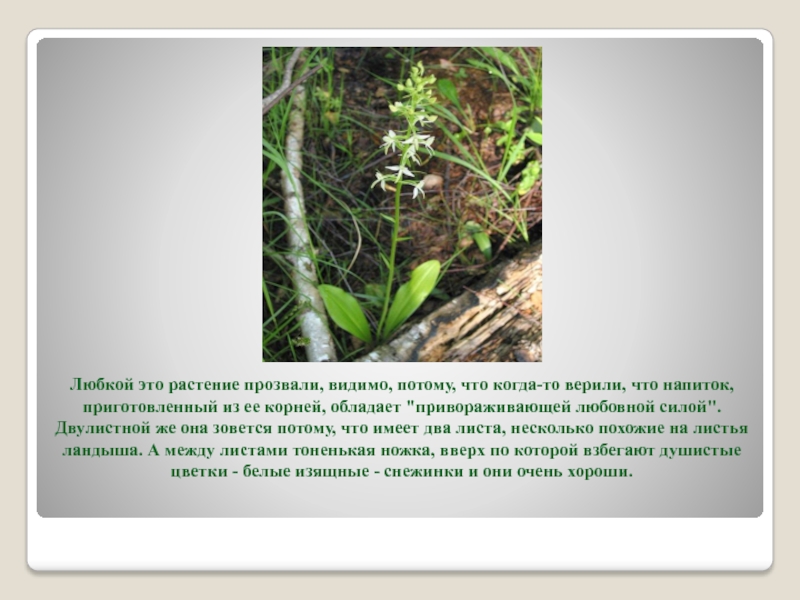 приготовленный из ее корней, обладает "привораживающей любовной силой". Двулистной же она зовется потому, что имеет два листа, несколько похожие на листья ландыша. А между листами тоненькая ножка, вверх по которой взбегают душистые цветки - белые изящные - снежинки и они очень хороши.