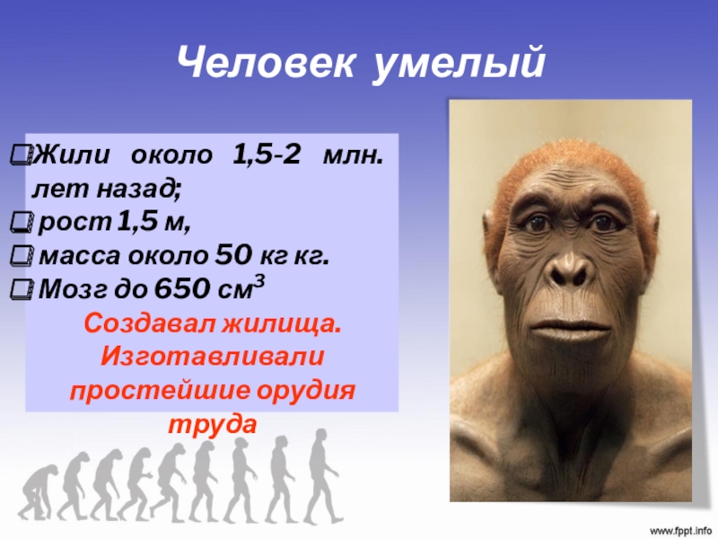 тыс лет назад; рост 1,5 м, масса около 50 кг кг. Мозг до 650 см3
