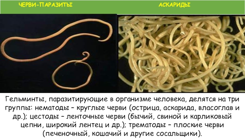 Гельминты, паразитирующие в организме человека, делятся на три группы: нематоды – круглые черви (острица, аскарида, власоглав и др.); цестоды – ленточные черви (бычий, свиной и карликовый цепни, широкий лентец и др.); трематоды – плоские черви (печеночный, кошачий и другие сосальщики).