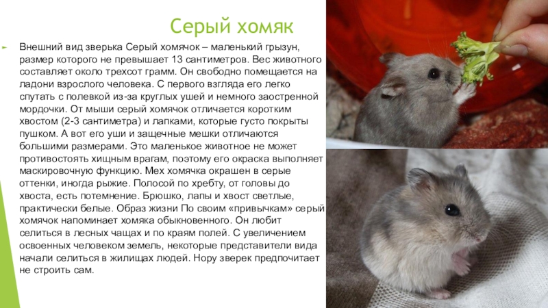 Внешний вид зверька Серый хомячок – маленький грызун, размер которого не превышает 13 сантиметров. Вес животного составляет около трехсот грамм. Он свободно помещается на ладони взрослого человека. С первого взгляда его легко спутать с полевкой из-за круглых ушей и немного заостренной мордочки. От мыши серый хомячок отличается коротким хвостом (2-3 сантиметра) и лапками, которые густо покрыты пушком. А вот его уши и защечные мешки отличаются большими размерами. Это маленькое животное не может противостоять хищным врагам, поэтому его окраска выполняет маскировочную функцию. Мех хомячка окрашен в серые оттенки, иногда рыжие. Полосой по хребту, от головы до хвоста, есть потемнение. Брюшко, лапы и хвост светлые, практически белые. Образ жизни По своим «привычкам» серый хомячок напоминает хомяка обыкновенного. Он любит селиться в лесных чащах и по краям полей. С увеличением освоенных человеком земель, некоторые представители вида начали селиться в жилищах людей. Нору зверек предпочитает не строить сам.