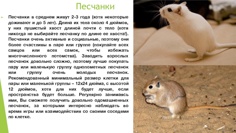Песчанки в среднем живут 2-3 года (хотя некоторые доживают и до 5 лет). Длина их тела около 4 дюймов, у них пушистый хвост длиной почти с тело (хотя никогда не выбирайте песчанку по длине ее хвоста!). Песчанки очень активные и социальные, поэтому они более счастливы в паре или группе (покупайте всех самцов или всех самок, чтобы избежать многочисленного потомства). Заводить взрослых песчанок довольно сложно, поэтому лучше покупать пару или маленькую группу однопометных песчанок или группу очень молодых песчанок. Рекомендованный минимальный размер клетки для пары или маленькой группы – 12х24 дюйма, с высотой 12 дюймов, хотя для них будет лучше, если пространства будет больше. Регулярно занимаясь ими, Вы сможете получить довольно одомашненных песчанок, за которыми интересно наблюдать во время игры или взаимодействия со своими соседями по клетке.