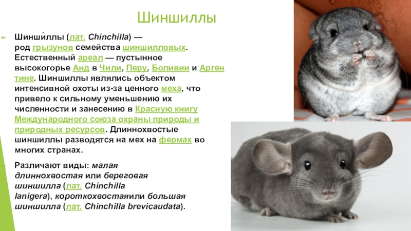 Шинши́ллы (лат. Chinchilla) — род грызунов семейства шиншилловых. Естественный ареал — пустынное высокогорье Анд в Чили, Перу, Боливии и Аргентине. Шиншиллы являлись объектом интенсивной охоты из-за ценного меха, что привело к сильному уменьшению их численности и занесению в Красную книгу Международного союза охраны природы и природных ресурсов. Длиннохвостые шиншиллы разводятся на мех на фермах во многих странах.