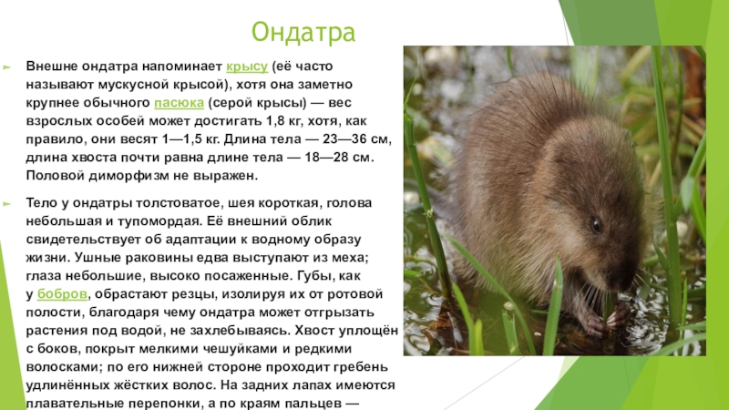 Тело у ондатры толстоватое, шея короткая, голова небольшая и тупомордая. Её внешний облик свидетельствует об адаптации к водному образу жизни. Ушные раковины едва выступают из меха; глаза небольшие, высоко посаженные. Губы, как у бобров, обрастают резцы, изолируя их от ротовой полости, благодаря чему ондатра может отгрызать растения под водой, не захлебываясь. Хвост уплощён с боков, покрыт мелкими чешуйками и редкими волосками; по его нижней стороне проходит гребень удлинённых жёстких волос. На задних лапах имеются плавательные перепонки, а по краям пальцев — окаймление из коротких волос.