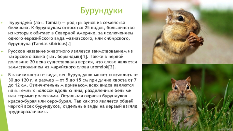 Бурундуки́ (лат. Tamias) — род грызунов из семейства беличьих. К бурундукам относятся 25 видов, большинство из которых обитает в Северной Америке, за исключением одного евразийского вида —азиатского, или сибирского, бурундука (Tamias sibiricus).]