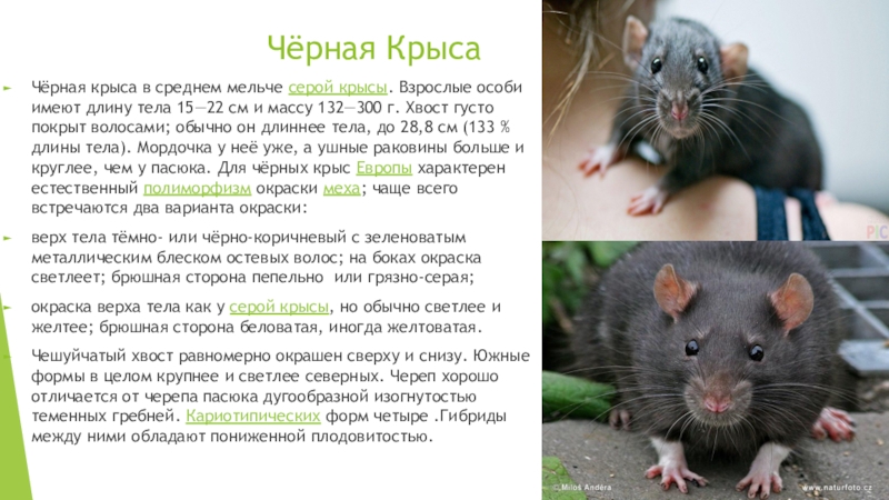 Чёрная крыса в среднем мельче серой крысы. Взрослые особи имеют длину тела 15—22 см и массу 132—300 г. Хвост густо покрыт волосами; обычно он длиннее тела, до 28,8 см (133 % длины тела). Мордочка у неё уже, а ушные раковины больше и круглее, чем у пасюка. Для чёрных крыс Европы характерен естественный полиморфизм окраски меха; чаще всего встречаются два варианта окраски: