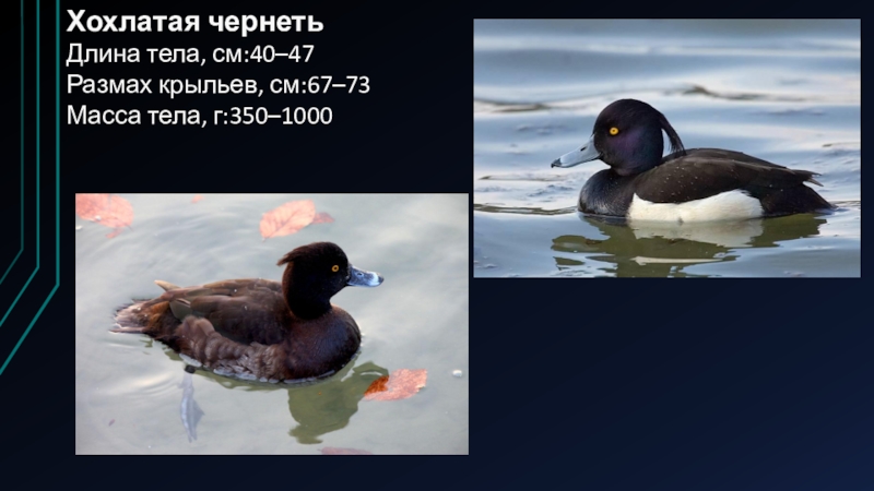 Хохлатая чернетьДлина тела, см:40–47Размах крыльев, см:67–73Масса тела, г:350–1000