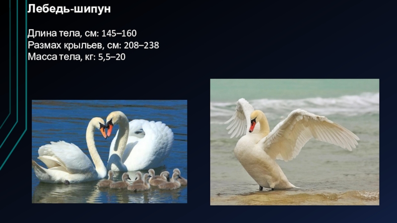 Лебедь-шипун Длина тела, см: 145–160Размах крыльев, см: 208–238Масса тела, кг: 5,5–20