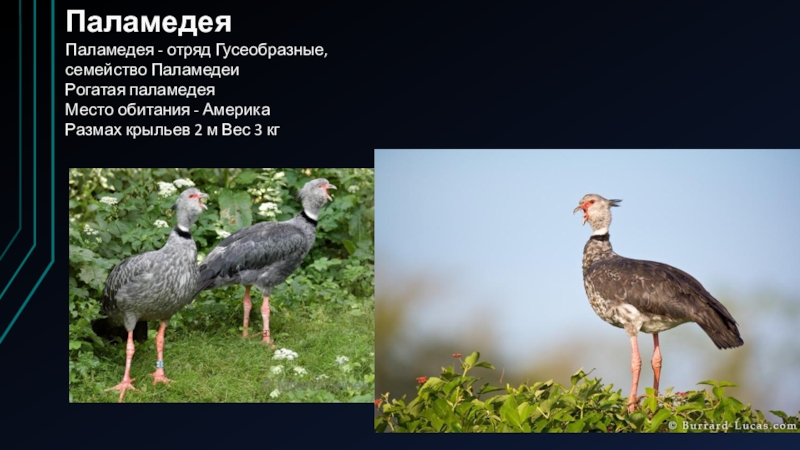 ПаламедеяПаламедея - отряд Гусеобразные, семейство Паламедеи Рогатая паламедея Место обитания - Америка Размах крыльев 2 м Вес 3 кг