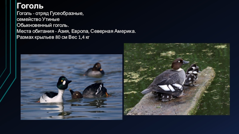 ГогольГоголь - отряд Гусеобразные, семейство УтиныеОбыкновенный гоголь. Места обитания - Азия, Европа, Северная Америка. Размах крыльев 80 см