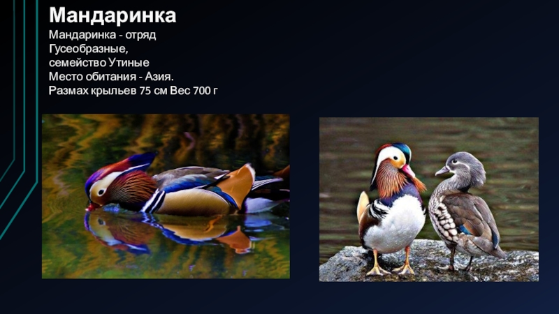 МандаринкаМандаринка - отряд Гусеобразные, семейство Утиные Место обитания - Азия. Размах крыльев 75 см Вес 700 г