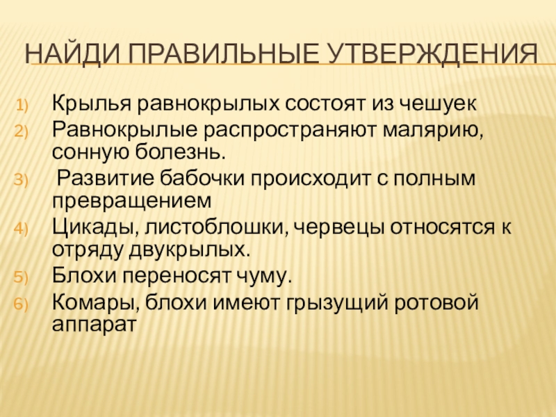 найди правильные утвержденияКрылья равнокрылых состоят из чешуекРавнокрылые распространяют малярию, сонную болезнь. Развитие бабочки происходит с полным превращениемЦикады,