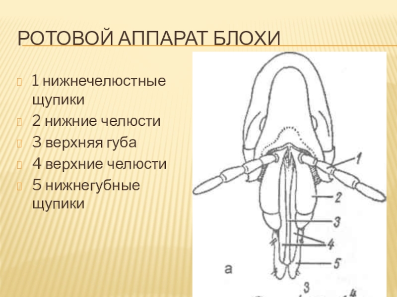 Ротовой аппарат блохи1 нижнечелюстные щупики2 нижние челюсти3 верхняя губа4 верхние челюсти5 нижнегубные щупики