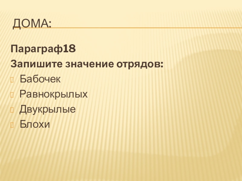 Дома:Параграф18Запишите значение отрядов:Бабочек Равнокрылых Двукрылые Блохи