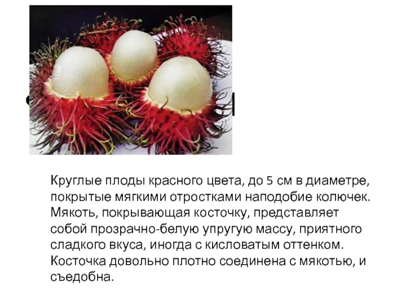 отростками наподобие колючек. Мякоть, покрывающая косточку, представляет собой прозрачно-белую упругую массу, приятного сладкого вкуса, иногда с кисловатым оттенком. Косточка довольно плотно соединена с мякотью, и съедобна.