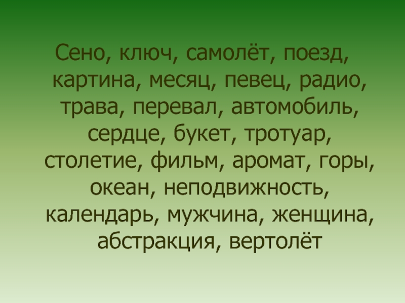 Слайд 25Сено, ключ, самолёт, поезд, картина, месяц, певец, радио, трава, перевал, автомобиль,