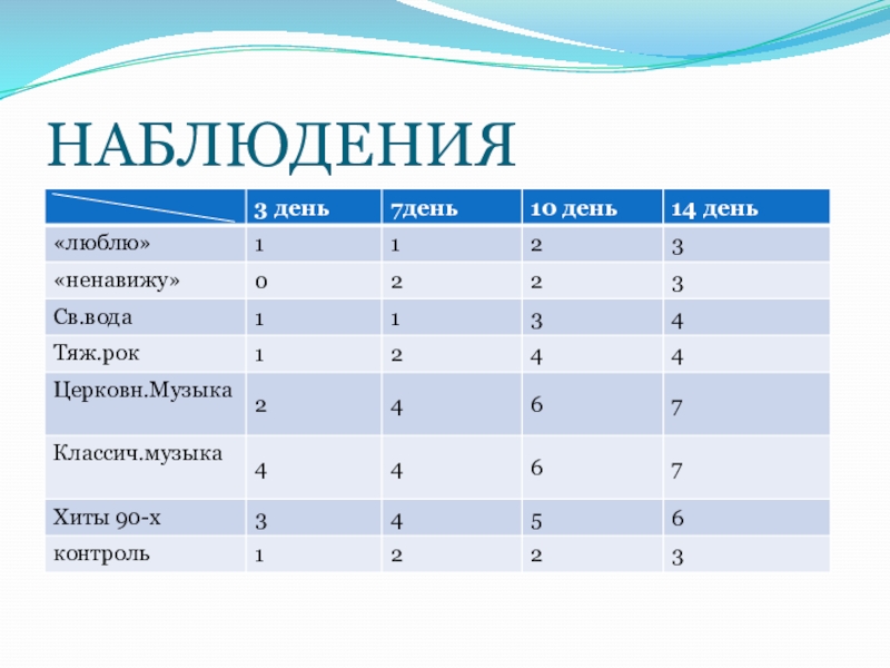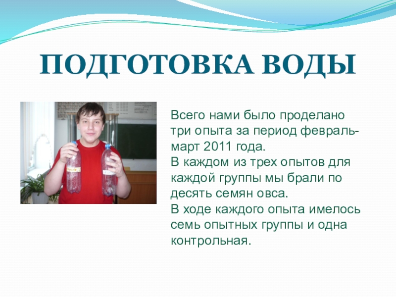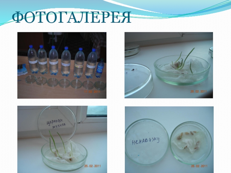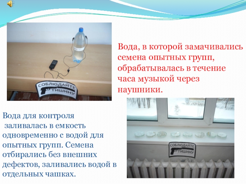 заливалась в емкость одновременно с водой для опытных групп. Семена отбирались без внешних дефектов, заливались водой в отдельных чашках.