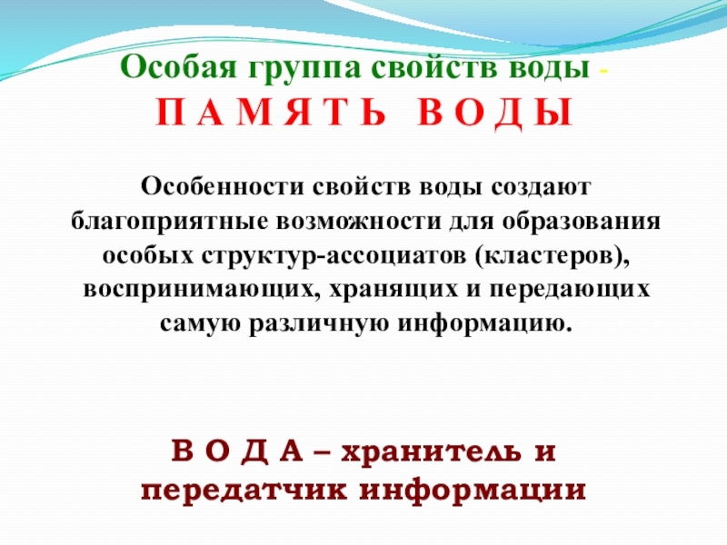 Особенности свойств воды создают благоприятные возможности для образования особых структур-ассоциатов (кластеров), воспринимающих, хранящих и передающих самую различную информацию.