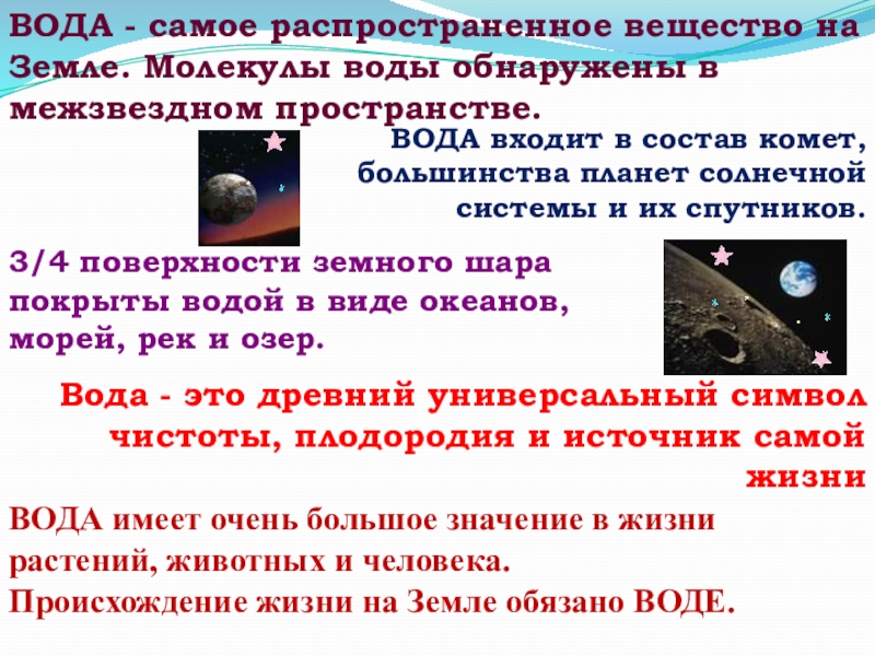 ВОДА - самое распространенное вещество на Земле. Молекулы воды обнаружены в межзвездном пространстве.