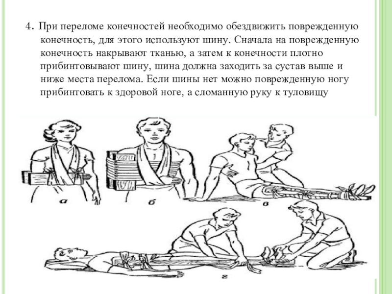 4. При переломе конечностей необходимо обездвижить поврежденную конечность, для этого используют шину. Сначала на поврежденную конечность накрывают