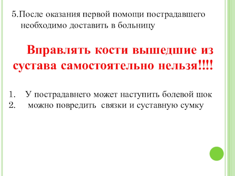 5.После оказания первой помощи пострадавшего необходимо доставить в больницуВправлять кости вышедшие из сустава самостоятельно нельзя!!!!У пострадавнего может