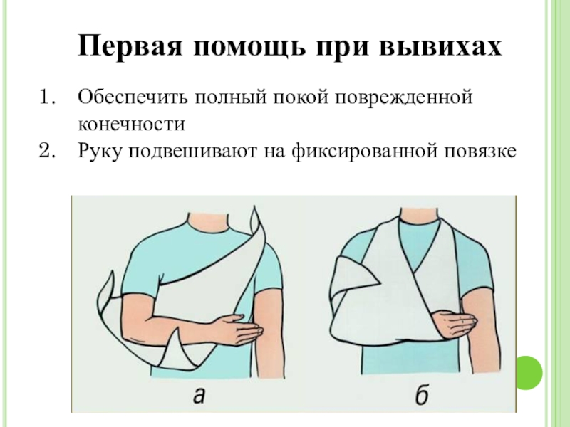 Первая помощь при вывихахОбеспечить полный покой поврежденной конечностиРуку подвешивают на фиксированной повязке