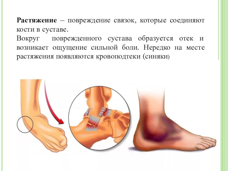 Слайд 3Растяжение – повреждение связок, которые соединяют кости в суставе.