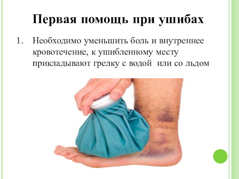 Первая помощь при ушибахНеобходимо уменьшить боль и внутреннее кровотечение, к ушибленному месту прикладывают грелку с водой или