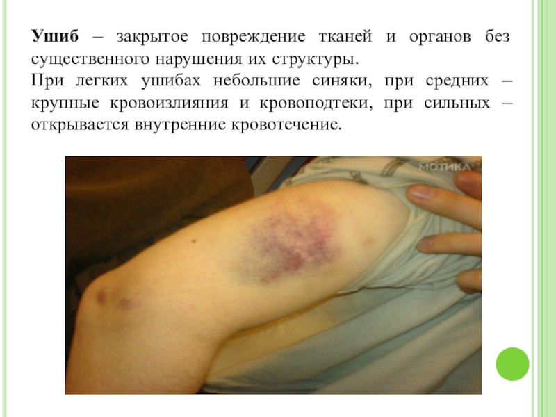 Слайд 10Ушиб – закрытое повреждение тканей и органов без существенного нарушения их