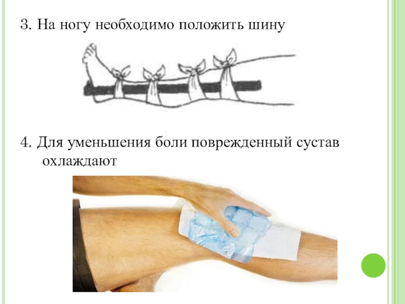 3. На ногу необходимо положить шину4. Для уменьшения боли поврежденный сустав охлаждают