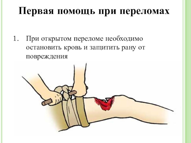 Первая помощь при переломахПри открытом переломе необходимо остановить кровь и защитить рану от повреждения