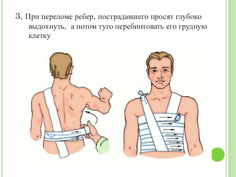 3. При переломе ребер, пострадавшего просят глубоко выдохнуть, а потом туго перебинтовать его грудную клетку