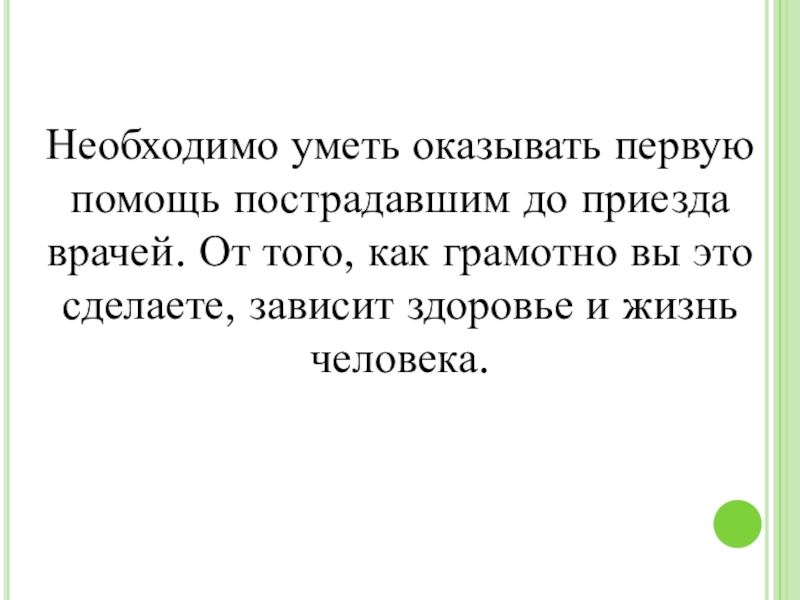 Слайд 20Необходимо уметь оказывать первую помощь пострадавшим до приезда врачей. От того,