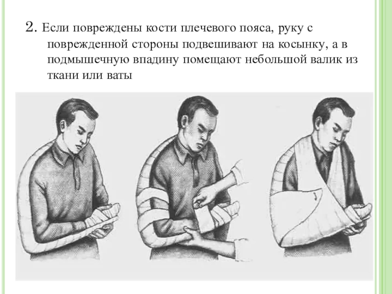 Слайд 152. Если повреждены кости плечевого пояса, руку с поврежденной стороны подвешивают