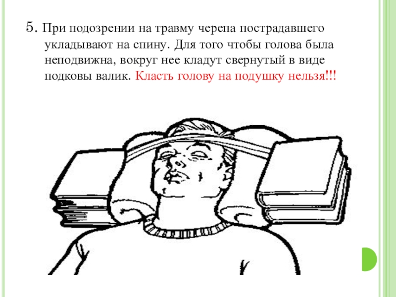 5. При подозрении на травму черепа пострадавшего укладывают на спину. Для того чтобы голова была неподвижна, вокруг