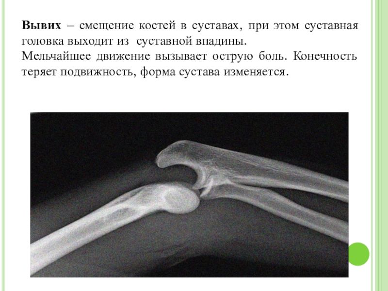 Вывих – смещение костей в суставах, при этом суставная головка выходит из суставной впадины.Мельчайшее движение вызывает острую
