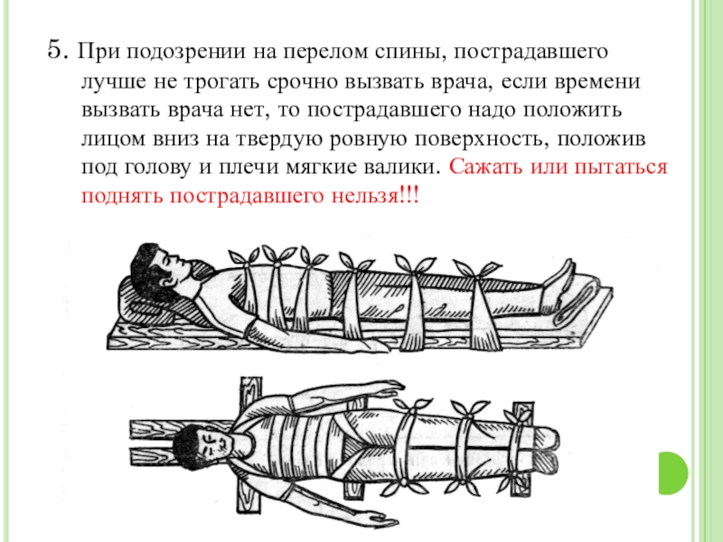 5. При подозрении на перелом спины, пострадавшего лучше не трогать срочно вызвать врача, если времени вызвать врача