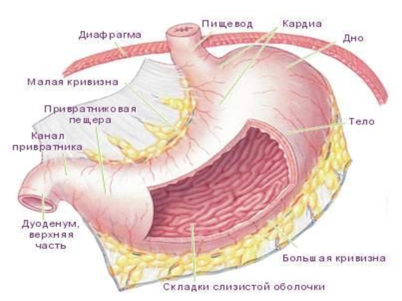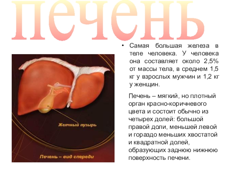 Печень – мягкий, но плотный орган красно-коричневого цвета и состоит обычно из четырех долей: большой правой доли, меньшей левой и гораздо меньших хвостатой и квадратной долей, образующих заднюю нижнюю поверхность печени.