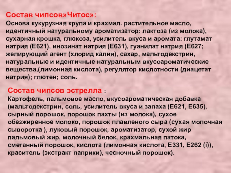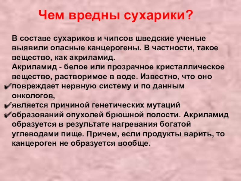 Слайд 24В составе сухариков и чипсов шведские ученые выявили опасные канцерогены. В