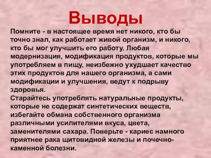как работает живой организм, и никого, кто бы мог улучшить его работу. Любая модернизация, модификация продуктов, которые мы употребляем в пищу, неизбежно ухудшает качество этих продуктов для нашего организма, а сами модификации и улучшения, ведут к подрыву здоровья.