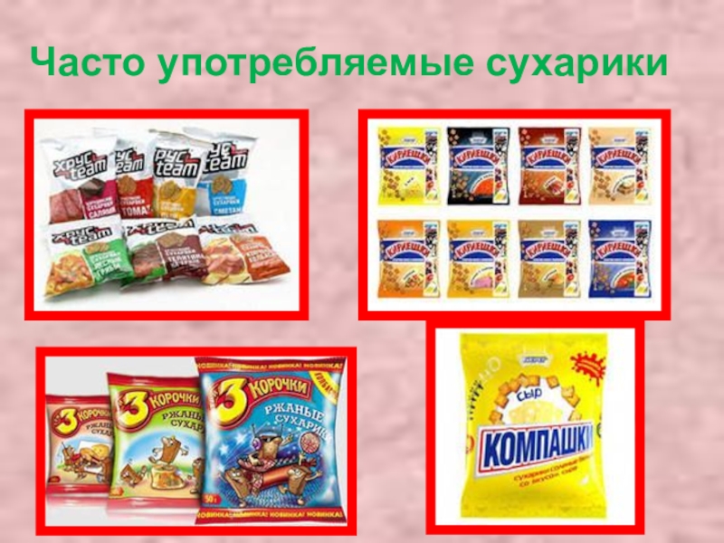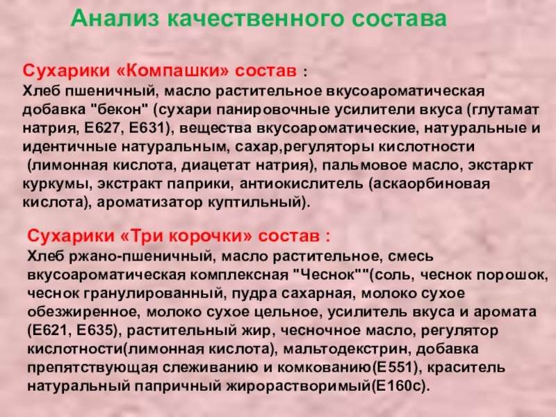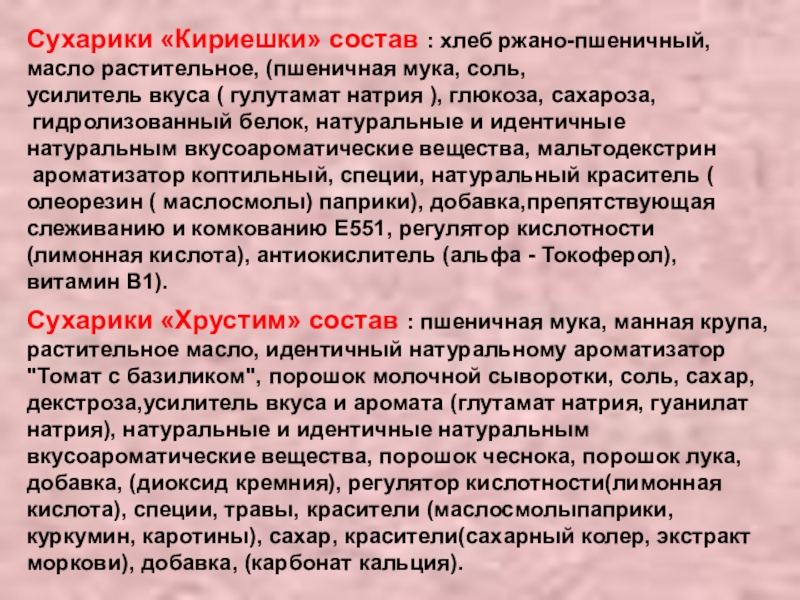 Слайд 23Сухарики «Кириешки» состав : хлеб ржано-пшеничный, масло растительное, (пшеничная мука, соль,