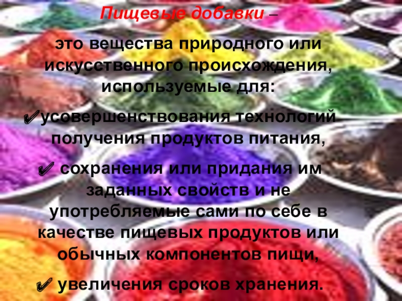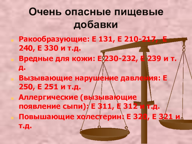 сложного комплекса внутренних факторов и внешних воздействий. Среди всей совокупности факторов, определяющих качество жизни, питанию принадлежит очень важная роль. Мы постоянно сталкиваемся с продуктами, в состав которых входят различные пищевые добавки Е: консерванты, красители, эмульгаторы и т.д. Исследования учёных показали, что целый ряд подобных веществ представляет серьезную угрозу для здоровья. На этикетах качественных товаров производителем указывают индекс, представленной буквой Е и трехзначной цифрой. Каждый индекс соответствует веществу, среди которых могут быть и вредные.
