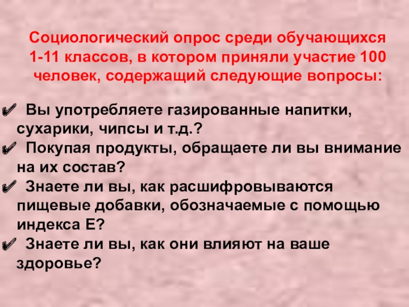 Слайд 9Социологический опрос среди обучающихся 1-11 классов, в котором приняли участие 100