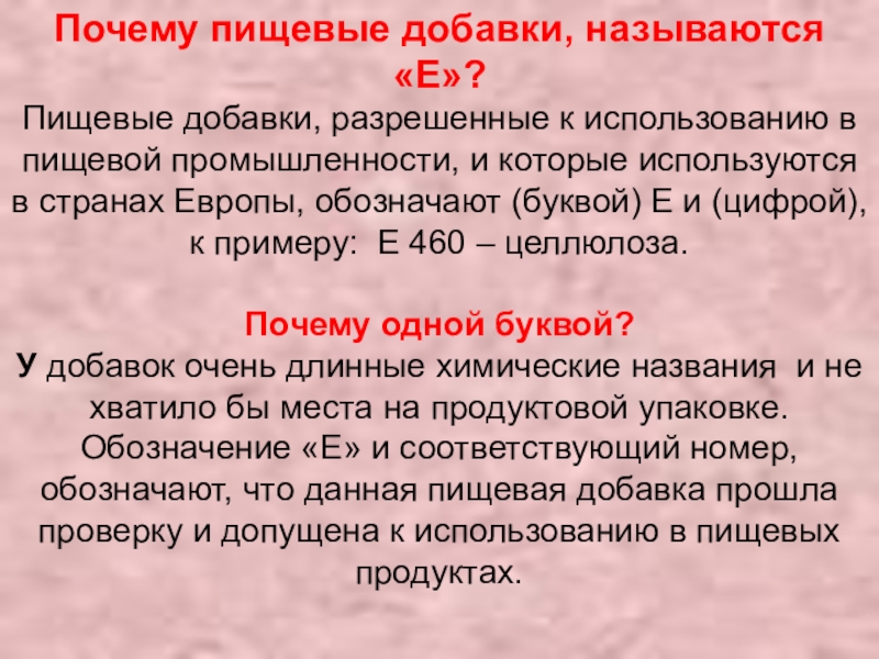 Слайд 25Почему пищевые добавки, называются «Е»?
