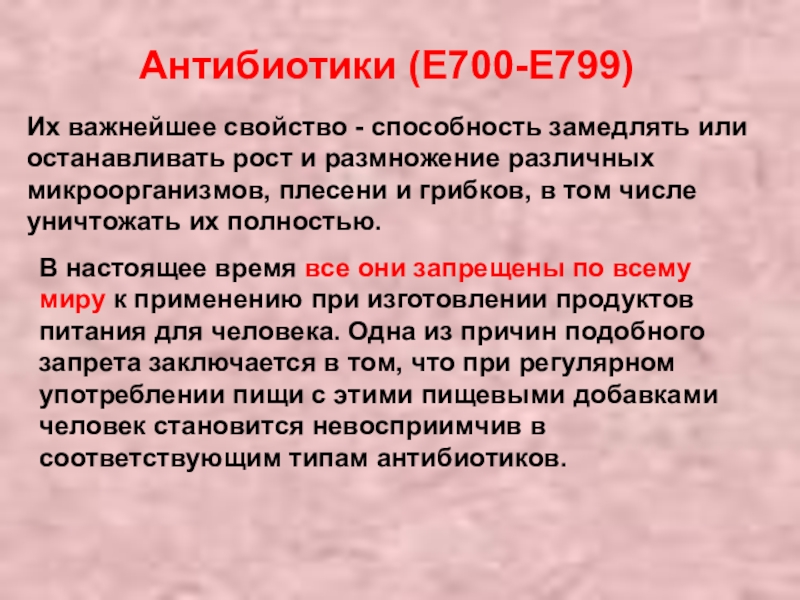 В настоящее время все они запрещены по всему миру к применению при изготовлении продуктов питания для человека. Одна из причин подобного запрета заключается в том, что при регулярном употреблении пищи с этими пищевыми добавками человек становится невосприимчив в соответствующим типам антибиотиков.